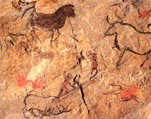 L’Âge de pierre…À la fin de l’art rupestre, en 10000 avant J.-C., se produit un nouveau bouleversement climatique (et sans doute faut-il y voir un lien) : la fin de la glaciation. Un changement qui a affecté la faune et la flore : vers 8000 avant J.-C., les grands troupeaux -rennes, rhinocéros laineux, mammouths- qui constituent l’essentiel des réserves de chasse qui s’exilent vers le nord, alors que, peu à peu, la forêt remplace la steppe et se peuple de petits gibiers -lapin, cerf, sanglier.